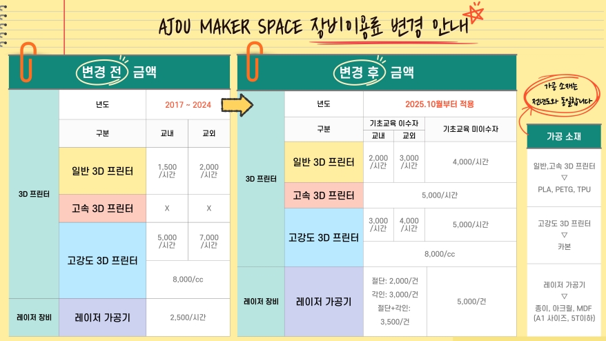 [메이커스페이스] 2025 장비이용료 변경 안내